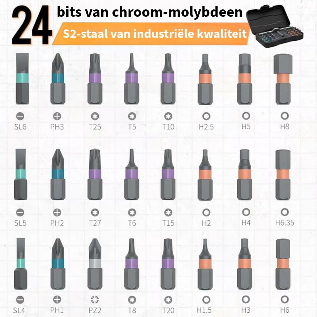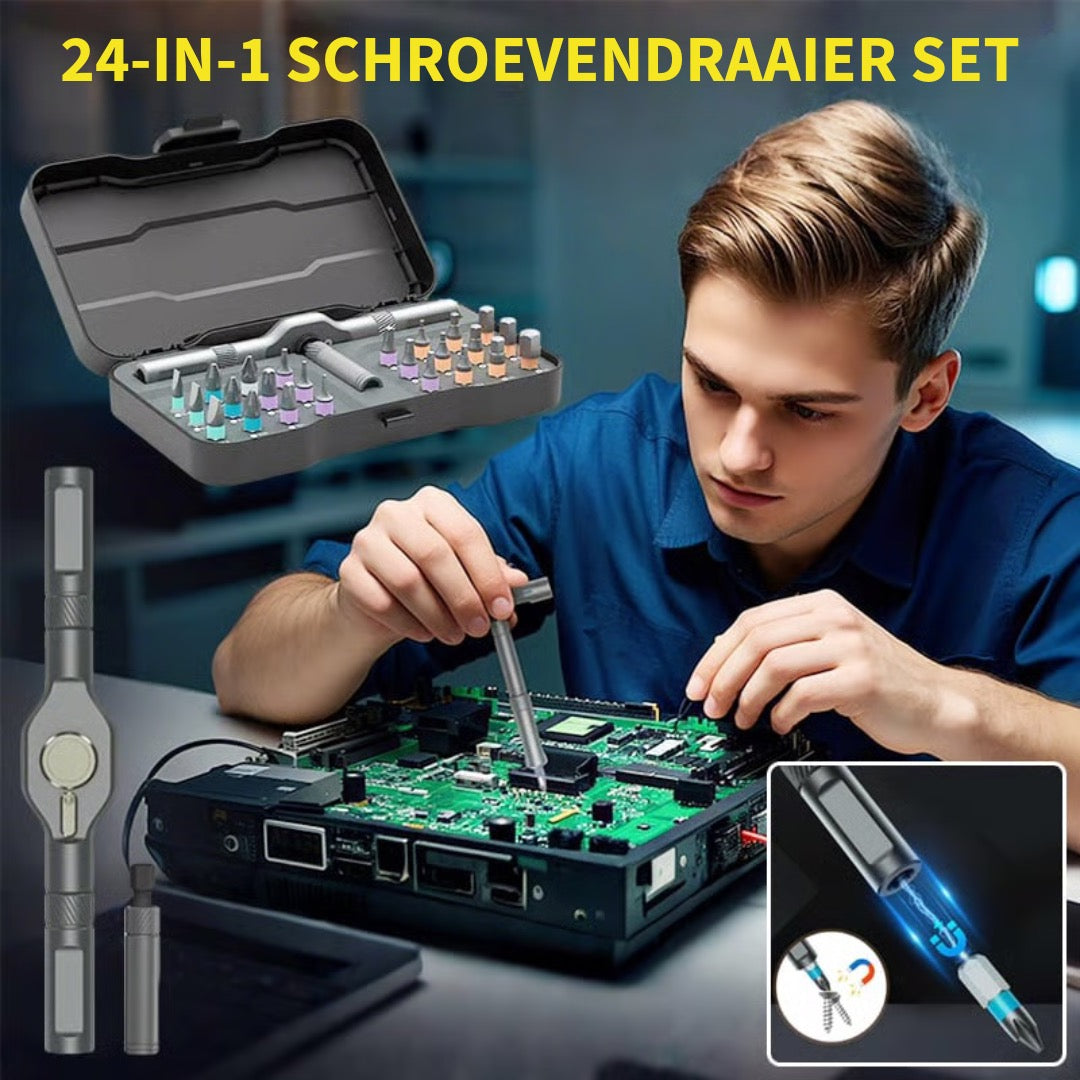 Met de 24-in-1 Schroevendraaier Set ben je voorbereid op elke klus. Of je nu werkt aan elektronica, meubels of huishoudelijke apparaten – dit compacte en krachtige gereedschap biedt precisie, kracht en veelzijdigheid in één handomdraai. Perfect voor wie efficiënt wil werken, thuis of professioneel, zonder onnodige gereedschapschaos.