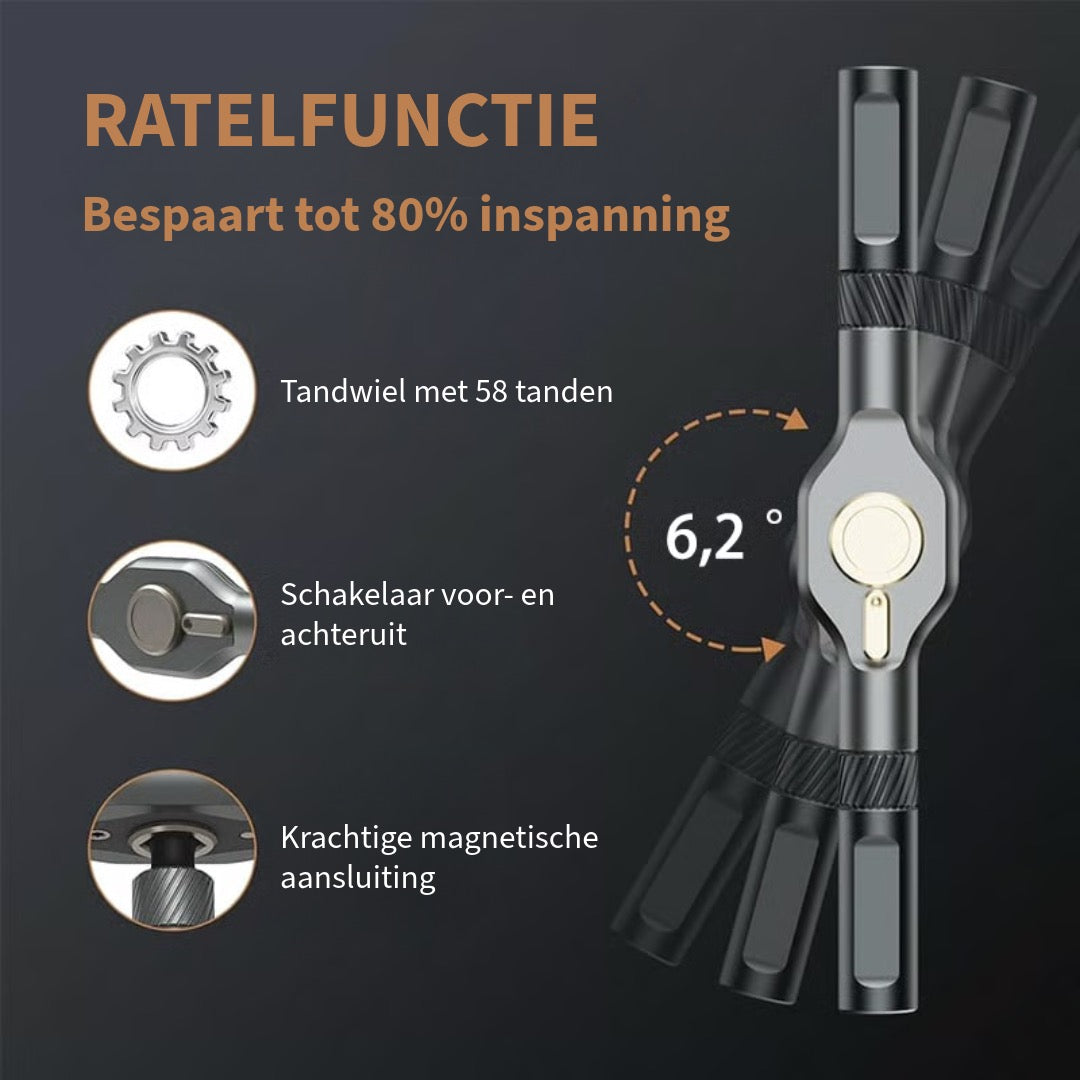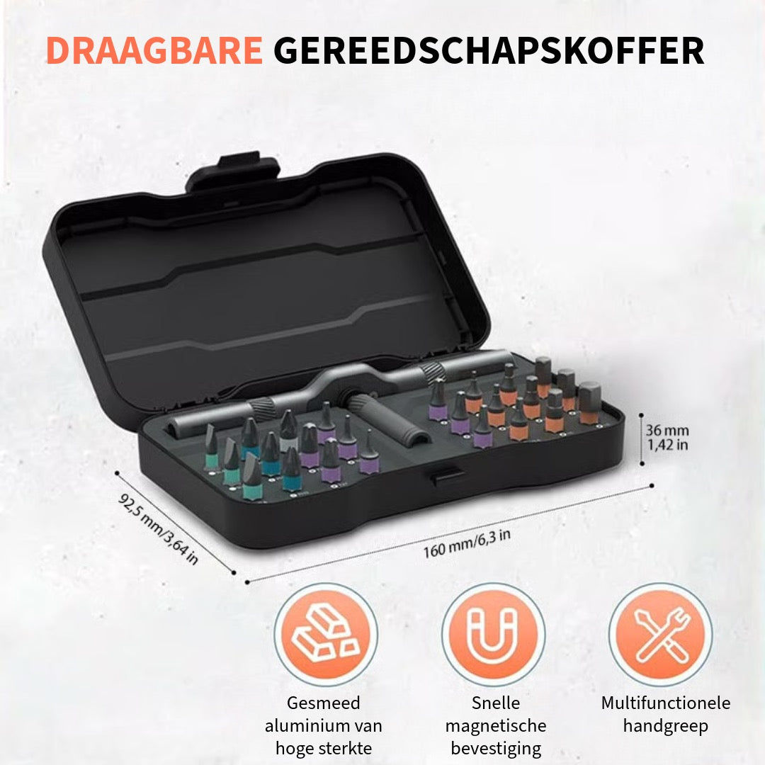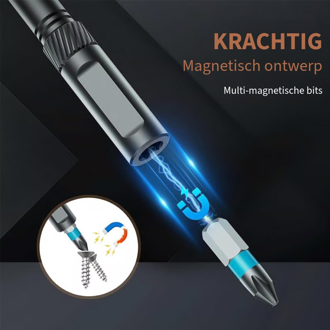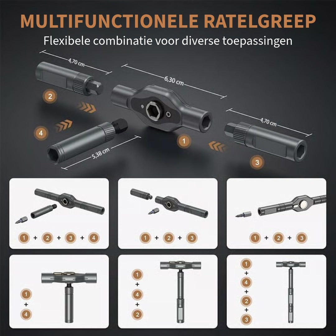 De verwisselbare ratelgreep en sterke magnetische grip zorgen dat je bits nooit wegglijden, zelfs niet bij precisiewerk. Dankzij de ergonomische handgreep werk je comfortabel en nauwkeurig, zonder vermoeide handen – ook bij langdurige klussen.