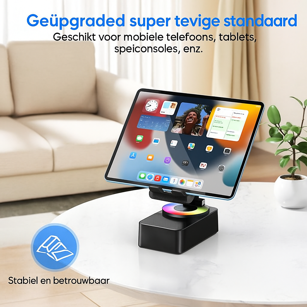 Deze draadloze speaker biedt niet alleen krachtig geluid, maar combineert ook een telefoonhouder, powerbank, sfeerverlichting én noodbatterij in één compact design. Perfect voor thuis, onderweg of op kantoor.