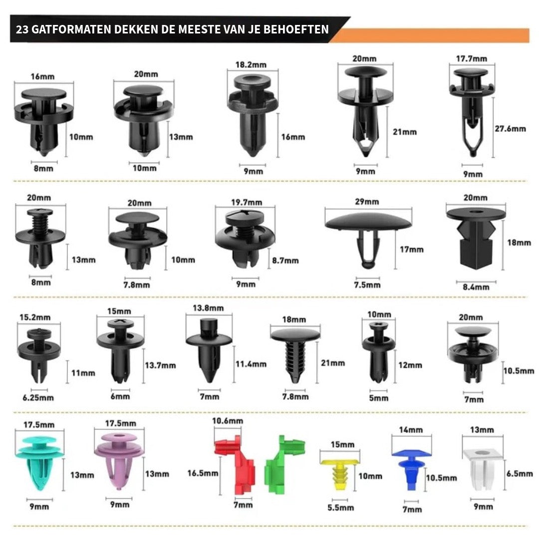 Perfect Georganiseerd voor Optimaal Gemak Alle clips worden geleverd in een stevige, georganiseerde opbergbox met overzichtelijke vakken. Hierdoor vindt u direct de juiste maat en houdt u uw werkplaats of kofferbak netjes en opgeruimd. Dit systeem is ontworpen voor netjes en efficiënt werken en is onmisbaar voor elke garage van zowel de doe-het-zelver als de professional.