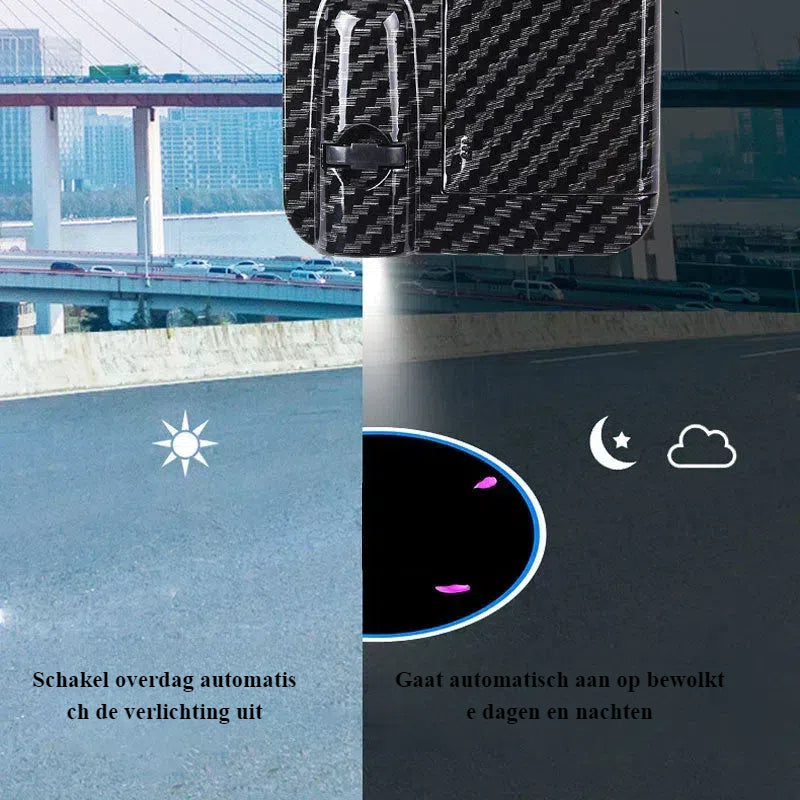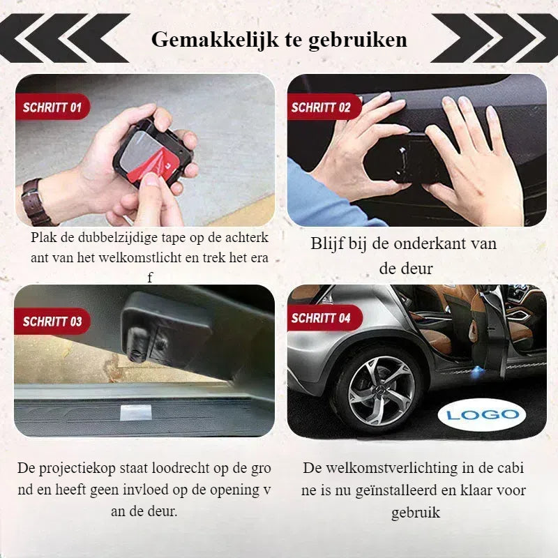 De Auto HD Welkomstverlichting biedt een verrassend heldere projectie die de grond rondom uw voertuig verlicht. Dankzij het krachtige LED-licht zijn er geen donkere gebieden meer die voor zorgen kunnen zorgen. Eenvoudig te installeren zonder boren of bedrading – de deuren worden direct lichtbronnen! Geniet van het comfort en de veiligheid die dit creatieve product in uw dagelijks leven brengt.