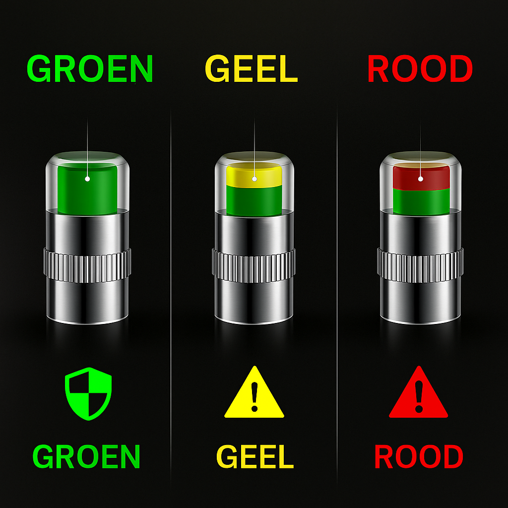 Controleer Uw Bandenspanning in Één Oogopslag Krijg directe zekerheid over de conditie van uw banden. Deze slimme ventieldopjes bieden een directe visuele controle dankzij het unieke, kleurgecodeerde systeem. In één blik ziet u of de spanning goed is (groen), te laag wordt (geel) of direct aandacht nodig heeft (rood). Zo controleert u uw banden snel en effectief, volledig zonder gereedschap.