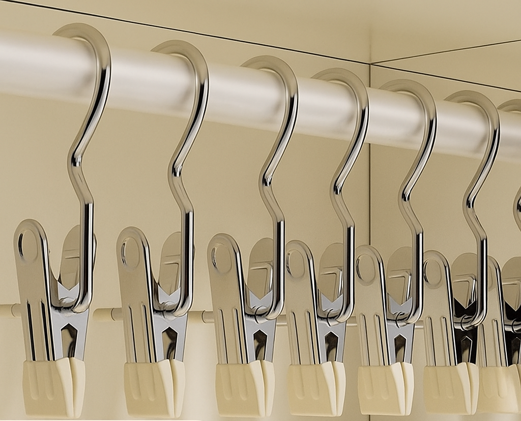 Gebruik de clips als compacte organizer in je kast of aan een droogrek. Dankzij het slimme ontwerp bespaar je ruimte en houd je alles overzichtelijk — van hoeden tot handdoeken.