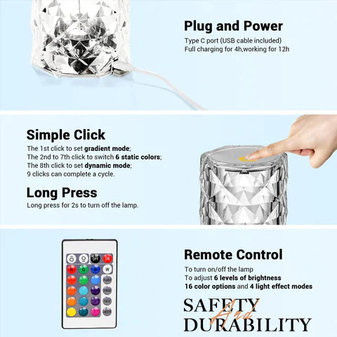 Creëer een Betoverend Lichteffect als een Diamant Breng een sfeer van moderne luxe in uw huis met dit unieke diamant-design. De lamp schittert dankzij een speciaal 3D-lichteffect en projecteert een prachtig rozenpatroon op uw tafel of bureau. Het kristalheldere, diamantgeslepen oppervlak creëert direct een romantische sfeer en geeft elke kamer een luxueuze uitstraling.