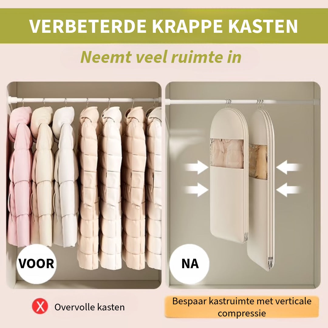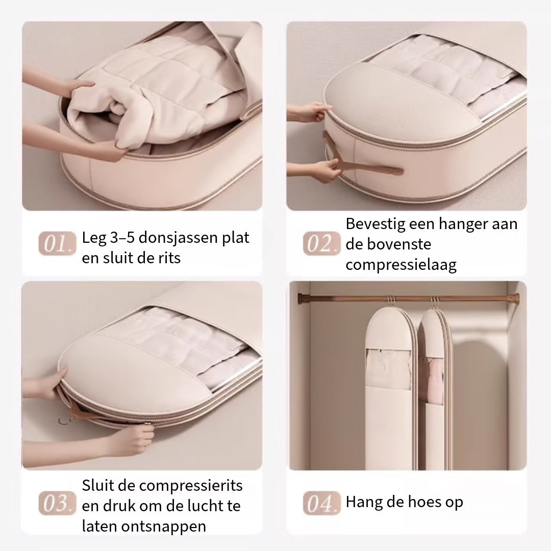 De Ruimtebesparende Kledinghoes is dé ideale manier om dikke dekens, jassen of beddengoed gecomprimeerd en overzichtelijk op te bergen. Dankzij het zelf-compressiesysteem en het ademende satijnmateriaal houd je je opbergruimte netjes, hygiënisch en stijlvol – zonder concessies aan comfort of kwaliteit.