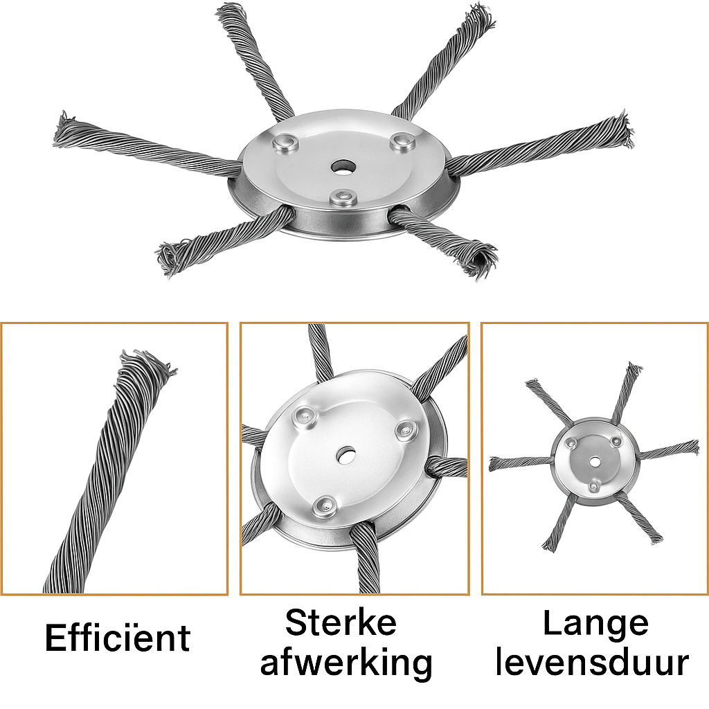 De stevige stalen draden zijn slijtvast en gaan lang mee, zelfs bij intensief gebruik op verharde oppervlakken. Geen gedoe meer met het vervangen van plastic draadspoelen.
