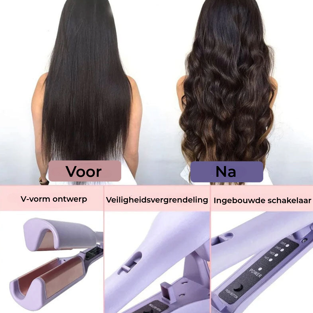Creëer Moeiteloos Professionele Franse Waves Haal de luxe van de salon in huis en creëer in enkele minuten een salonwaardige look. Dankzij de unieke V-vorm geeft deze krultang uw haar direct prachtige, diepe golven met ongekend veel volume en glans. Het resultaat is een stijlvolle, Franse wave-look met een perfect frizzvrij resultaat dat de hele dag indruk maakt.