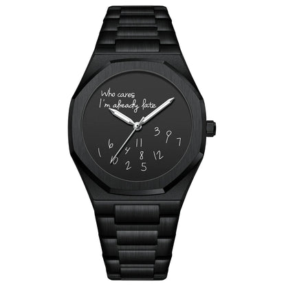 Waarom opgaan in de massa als je kunt opvallen met een betaalbaar designerstatement? Het ‘Who cares I’m already late’ Horloge is een uniek accessoire dat gesprekken uitlokt en jouw karakter weerspiegelt – recht aan je pols.